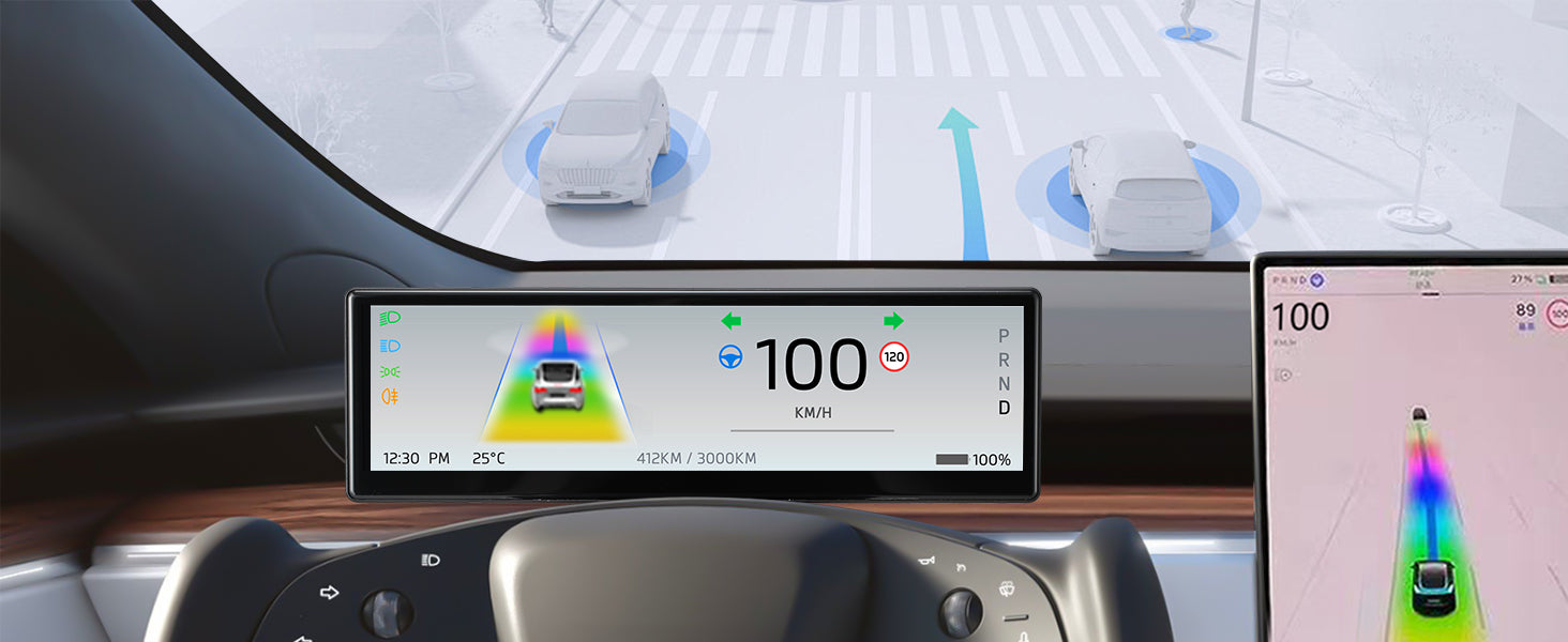 • Full Vehicle Data Sync – Displays real-time information from the Tesla central control system, including speed, gear, battery status, lights, door status, speed limits, Autopilot indicators, and tire pressure warnings.